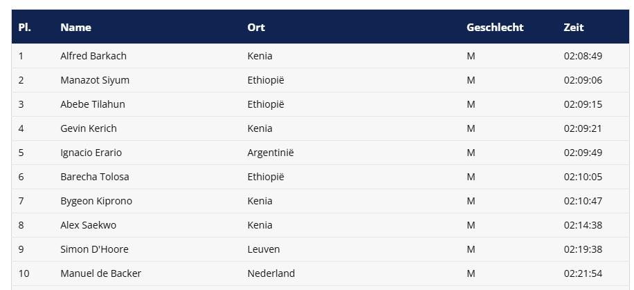 El triunfo quedó en manos del keniata Alfred Barkach con 2:08:49, seguido por los etíopes Manazot Syum (2:09:08) y Abebe Tirahun (2:09:18). El cuarto puesto fue para el también keniata Gevi Kerich con 2:09:21, mientras que Erario se ubicó como el mejor no africano de la competencia.